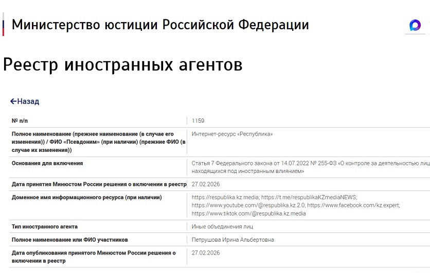В графе «участники проекта» в реестре указана главный редактор Respublika.kz.media Ирина Петрушова. Тип «иноагента» — «иные объединения лиц».