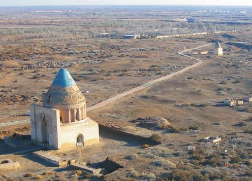 Вид на Кенеургенч и мавзолей султана Текеша. Фото wikimedia