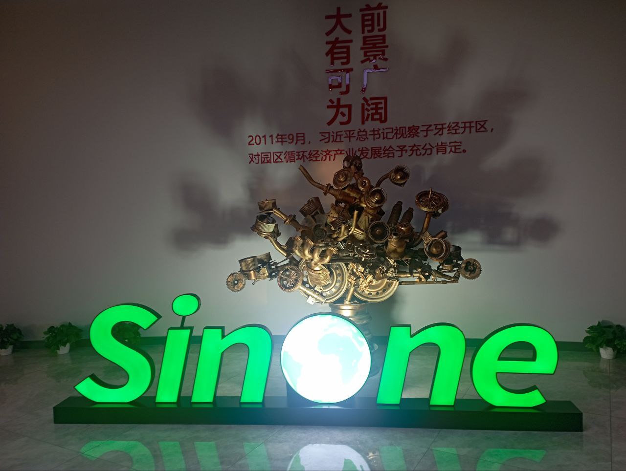 Представители компании отметили, что Sinone Group активно участвует в реализации государственной стратегии по достижению углеродной нейтральности и пика выбросов, делая ставку на «зеленую энергию». Уровень повторного использования отходов в производственном цикле группы достигает 99%. Офисное здание компании оформлено как экспозиция арт-объектов из металла, что подчеркивает внимание бизнеса к визуальной коммуникации и брендингу. На специальном экране словно в напоминание о том, для чего компания существует, транслируется видеоролик, посвященный системе экологического и производственного мониторинга Eye of the Earth.