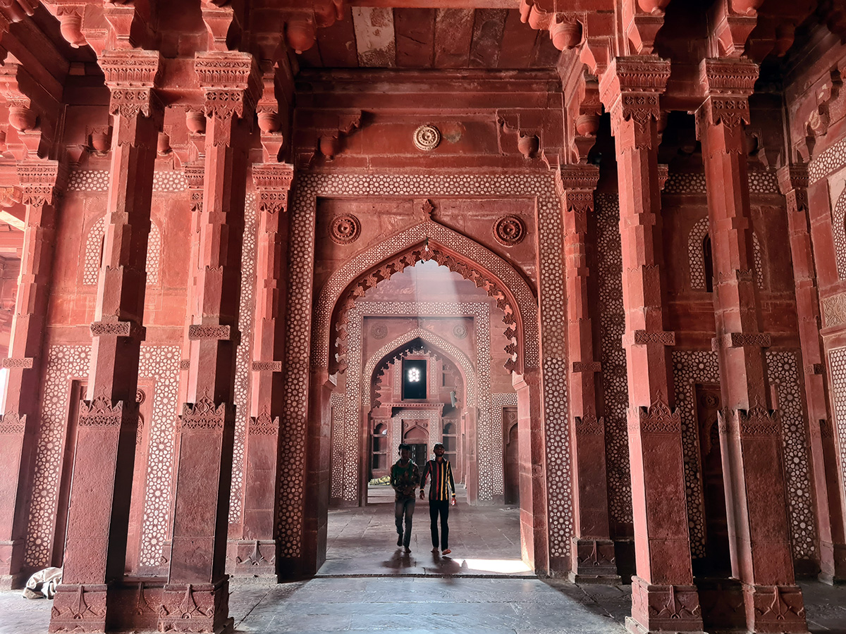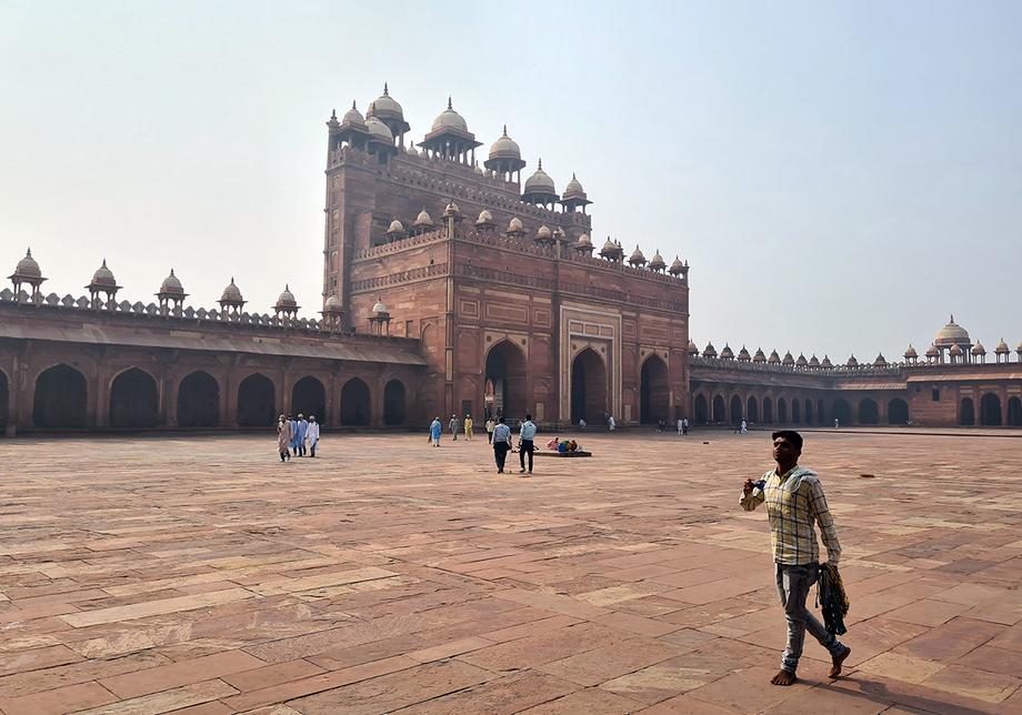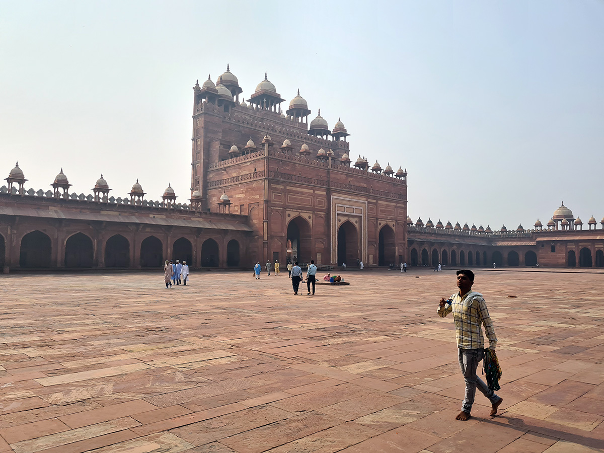 За Буланд Дарвазой перед пятничной мечетью простирается площадь 130 на 165 метров. Там достаточно места для десяти тысяч молящихся, а здание мечети — это уже сложный и изысканный «бирьяни». Оно не похоже ни на одно тимуридское или ближневосточное строение и носит черты архитектуры только что завоеванного Акбаром Гуджарата, прибрежной области на западе Индии, где когда-то осели бежавшие от мусульман иранские зороастрийцы (их потомок Фаррух Булсара прославится как Фредди Меркьюри).