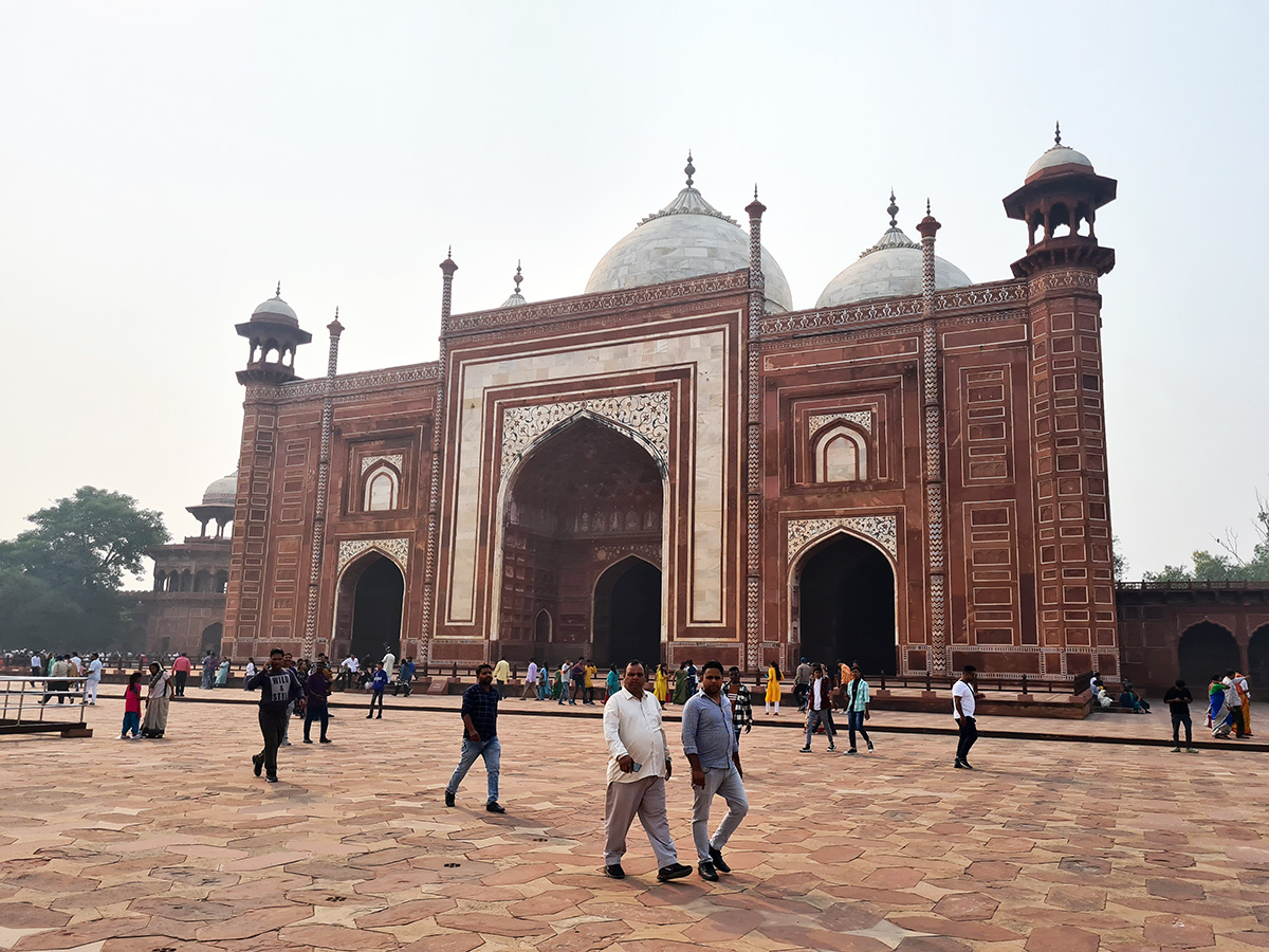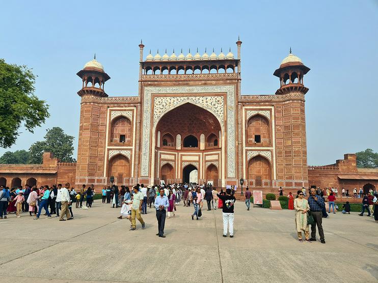 Посетители покидают сутолоку многолюдной, шумной, пахнущей пряной едой, выхлопными газами и мусором бывшей могольской столицы Агры и долго идут мимо многометровой высоты ограждений к «Великим вратам» (Дарваза-и равза), которые в любом другом месте были бы отдельным памятником архитектуры.