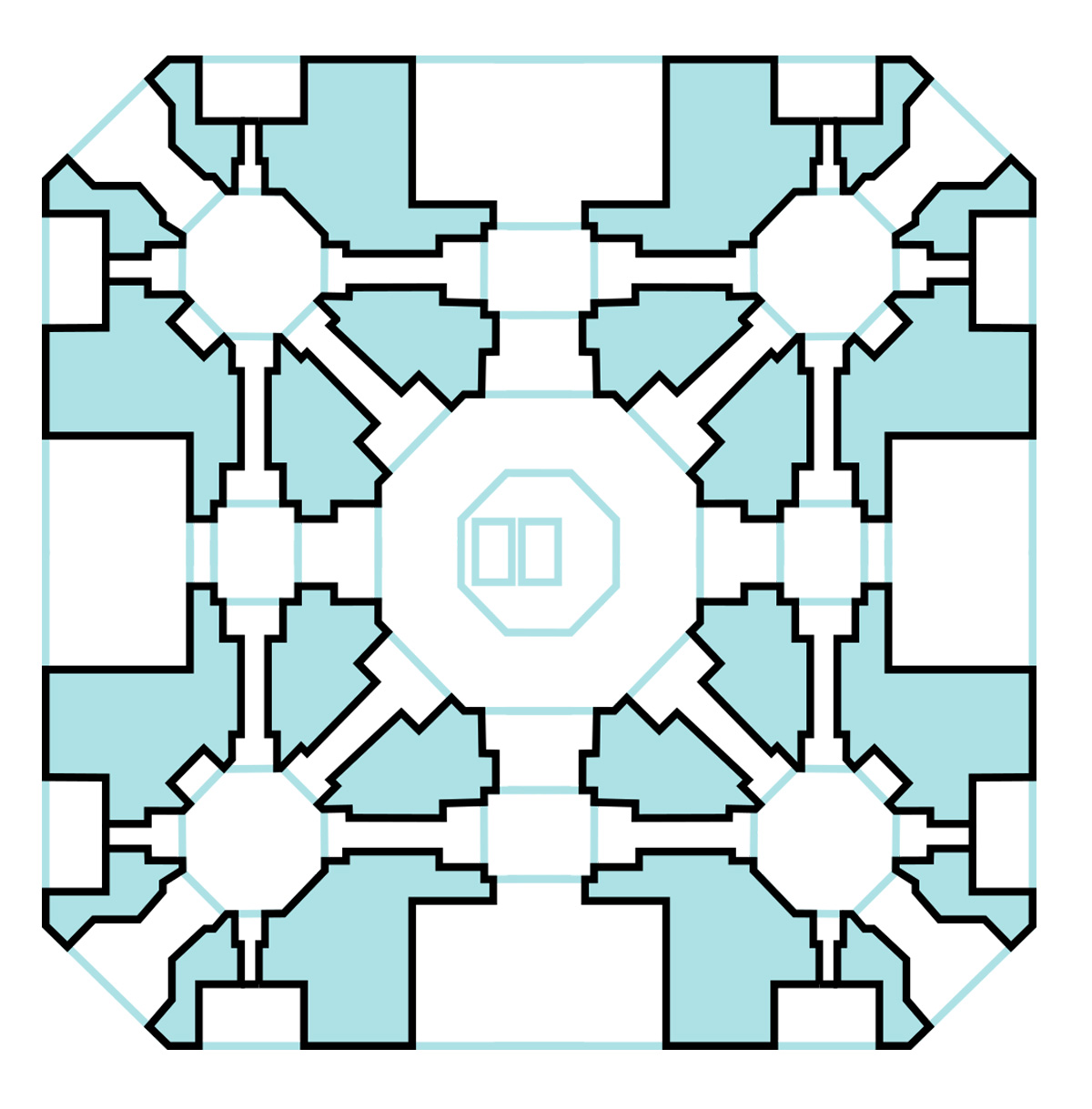 Столь же симметрично стоят две наубат-ханы, «дома барабанов», откуда объявляли прибытие гостей или били тревогу (см. русское «набат» и узбекское «навбатчи»).