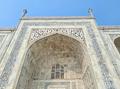 Сложенная из желтого и красного песчаника центральная часть сорокаметровой «двери» — вполне тимуридской архитектуры айван. Но стены «двери» украшены белым и черным мрамором, а верх утыкан чатри и небольшими шпилями.